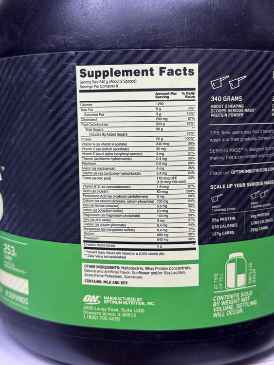 یک دوز از Serious Mass حاوی کالری با کیفیت بالا، عمدتا از کربوهیدرات های پیچیده، پروتئین های با کیفیت بالا و کراتین مونوهیدرات اضافی، گلوتامین، کولین، اینوزیتول و ترکیبی کامل از ویتامین ها و مواد معدنی ضروری است. کربوهیدرات ها عمدتاً پیچیده هستند، حاوی قند اضافه شده نیست، این ترکیب به بدن شما انرژی طولانی مدت می دهد و تضمین می کند که ماهیچه های شما دائماً مواد مغذی دریافت می کنند. ترکیب پروتئین شامل پروتئین وی، کازئین و تخم مرغ است که هر کدام زمان جذب متفاوتی دارند. پروتئین ها باعث رشد ماهیچه ها و حمایت از قدرت عضلانی می شوند.